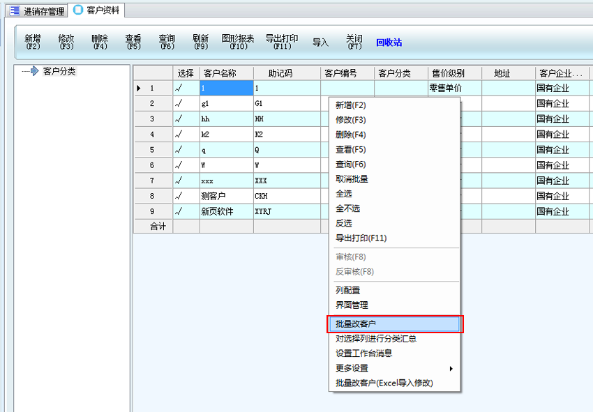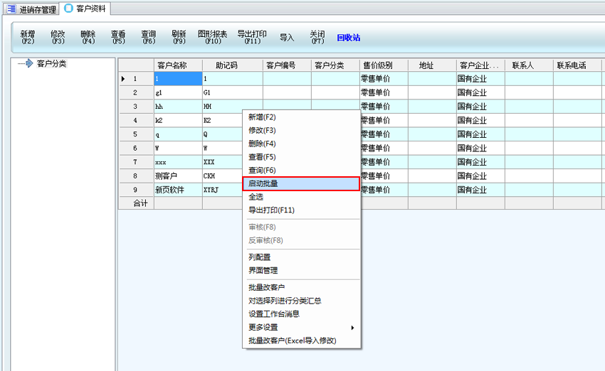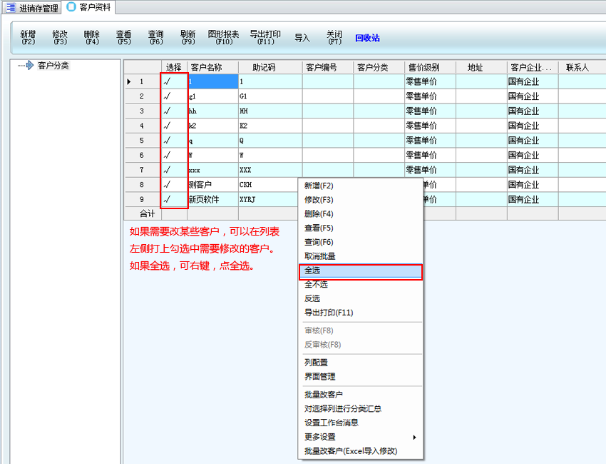 打開客戶資料,右鍵啟動批量,選擇要修改的客戶資料,如要全選則再次右鍵選擇全選。
