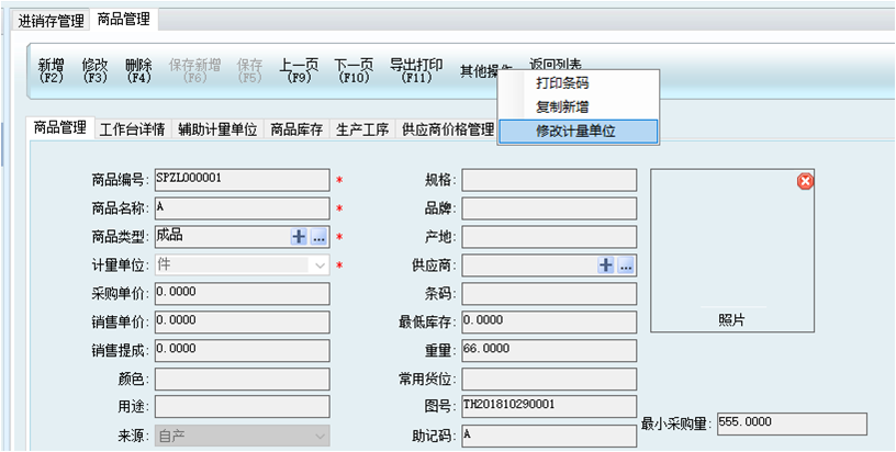 比如說商品A,原來的庫存是打,已經(jīng)入了庫,現(xiàn)在有12打,1打等于12件的,這個時候發(fā)現(xiàn)計量單位錯了,直接把打,改成件,那就本來應(yīng)該是144件的,現(xiàn)在庫存卻變成了12件。所以就限制了不能直接修改計量單位的。