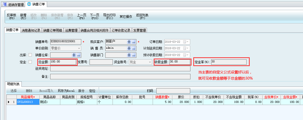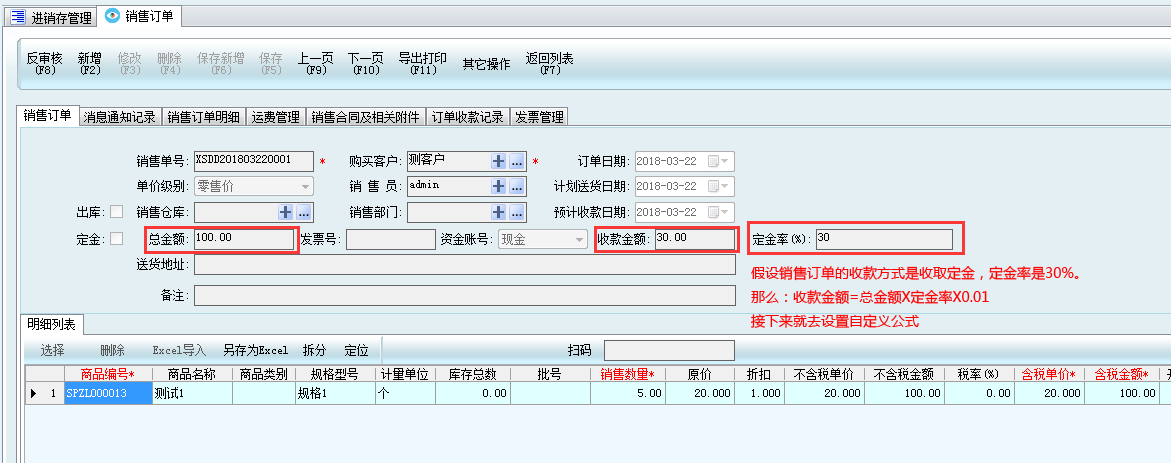 1、舉個例子,假設(shè)銷售訂單的收款方式是收取定金,定金率是30%,那么就要對“收款金額”這個數(shù)據(jù)設(shè)置計算公式,計算公式應(yīng)為: