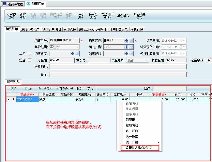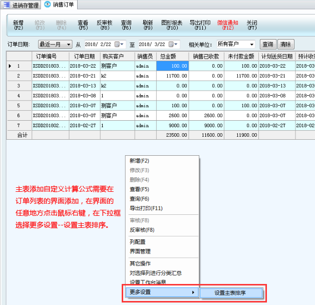 2、主表添加計算公式需要在訂單列表界面任意地方點擊鼠標(biāo)右鍵,選擇更多設(shè)置—設(shè)置主表排序。
