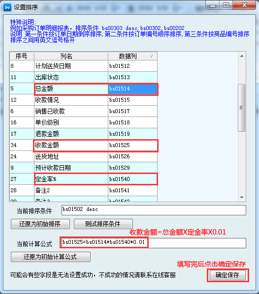3、在當(dāng)前計算公式的框中填寫公式:bs01525=bs01514*bs01540*0.01(對照數(shù)據(jù)列,意思即:收款金額=總金額X定金率X0.01),公式與公式之間用&隔開,填寫完后點擊確定保存。
