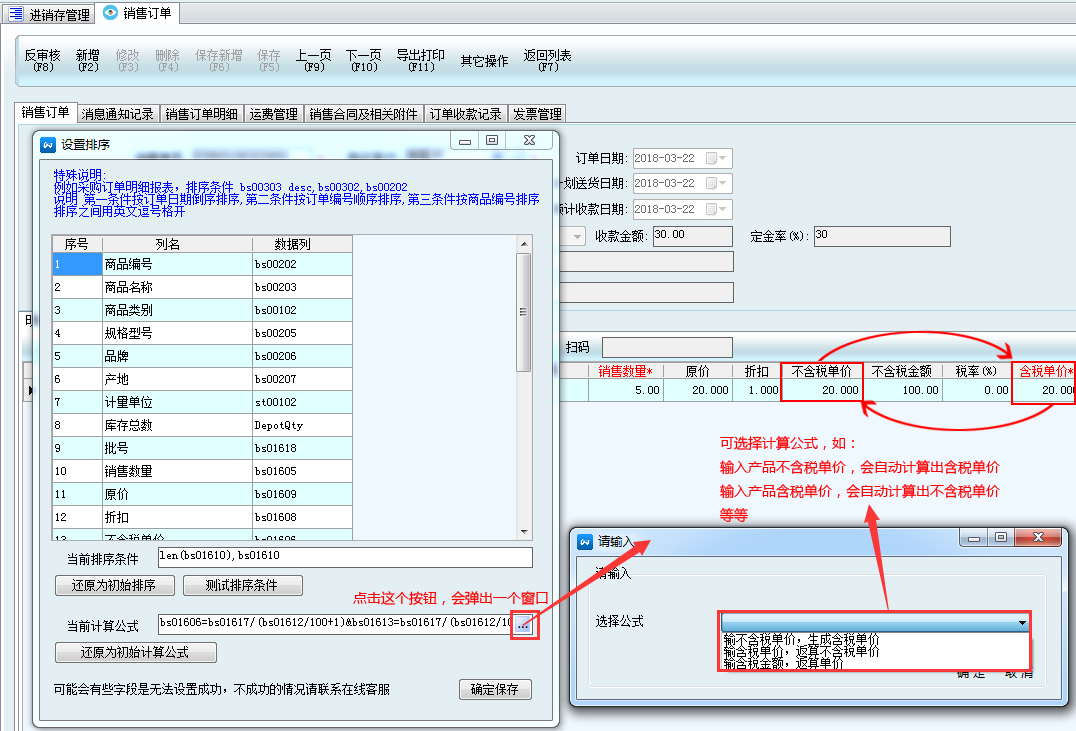 系統(tǒng)中涉及數(shù)據(jù)運算的功能都可以自定義計算公式,例如采購訂單、采購入庫、采購?fù)素?、銷售訂單、銷售出庫、銷售退貨、其他入庫、其他出庫等等,也可以對這些功能的主表和從表分別添加自定義公式。