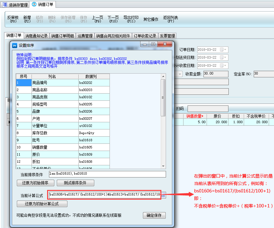 bs01620=bs01619*bs01605(即:總重=單重X銷售數(shù)量),公式與公式之間用&隔開,設(shè)置好后點擊確定保存。