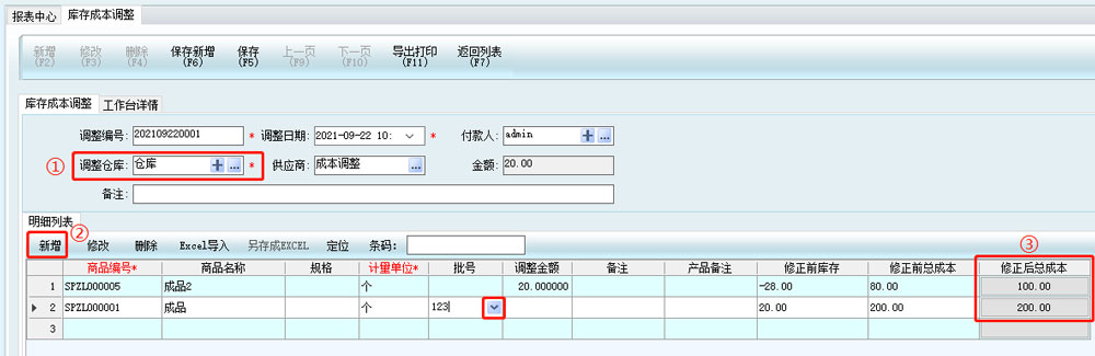 方法2:填寫成本單價(jià)后,勾選批號(hào)修改,并填寫要調(diào)整的批號(hào)