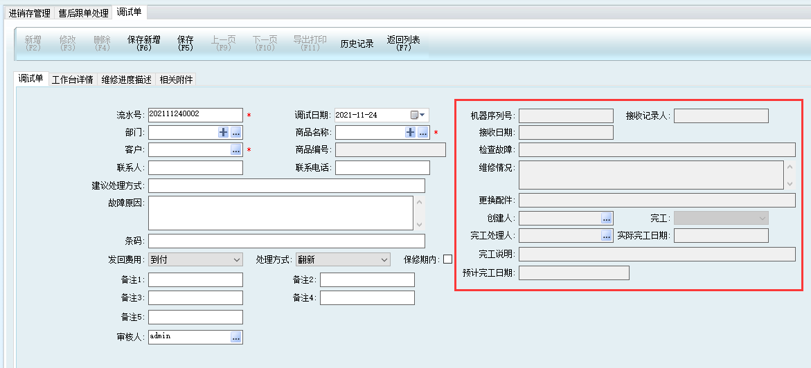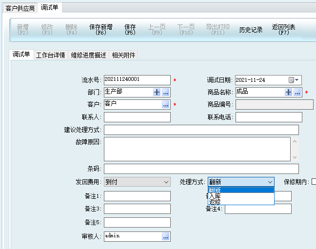 (1) 新增調試單,引用需要售后的商品以及對應的客戶,填寫資料后保存。