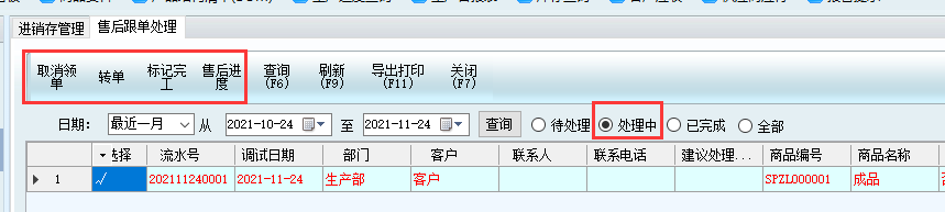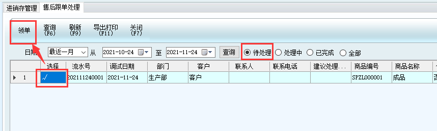 (2) 在售后跟單處理中,找到【待處理】的單據,勾選后點擊領單,并填寫預計完工時間