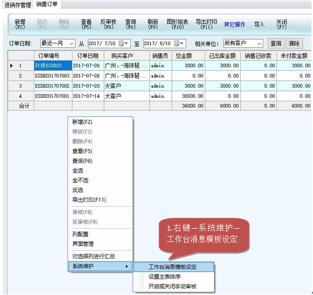 打開銷售訂單,右擊選擇“系統(tǒng)維護(hù)----設(shè)置工作臺消息模板”,接下來看圖文: