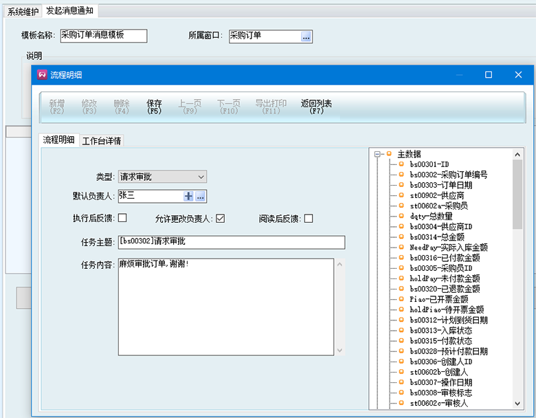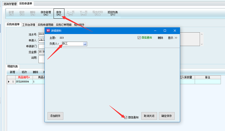 4、以采購訂單為例,勾選微信通知,點擊確定保存,即可發(fā)起消息