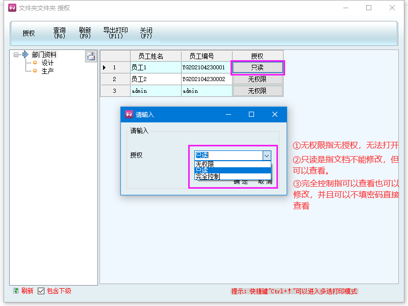 3、文件夾可以設(shè)置密碼,以及給操作員授權(quán)
