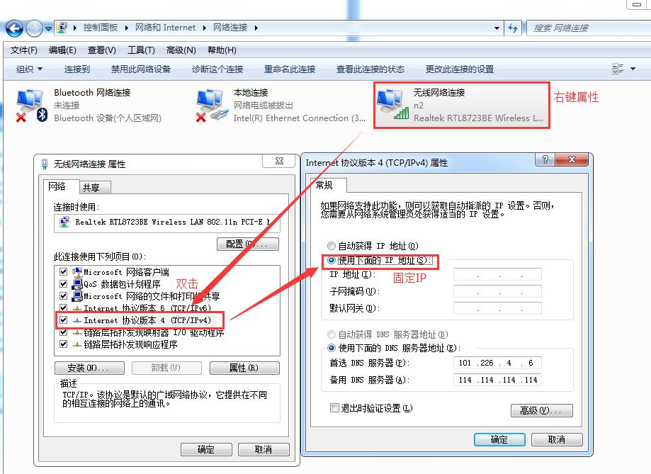 右鍵網(wǎng)絡(luò)連接---屬性---雙擊TCP/IPV4協(xié)議---使用下面的IP地址