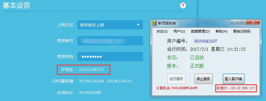 若IP地址不一致,需要致電寬帶運(yùn)營(yíng)商調(diào)出公網(wǎng)IP。此處IP地址非新頁公司提供。