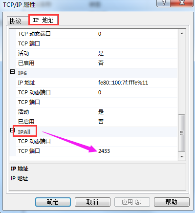 點(diǎn)擊IP地址,拉到最下面,找到IPALL,把動(dòng)態(tài)端口數(shù)值刪除,下面TCP端口填2433。確定