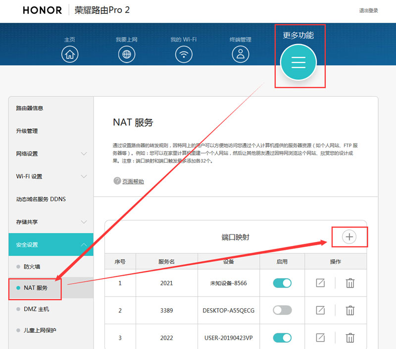 榮耀路由器的端口轉發(華為系的產品大部分都一樣)在更多功能-----安全設置-----NAT服務