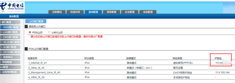 從接口配置----WAN接口配置看到,此IP地址為公網IP地址,符合互聯網模式條件