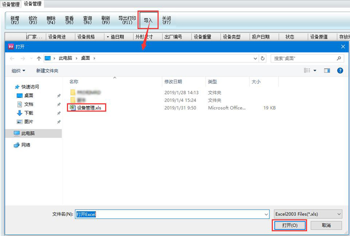2、設(shè)備管理,菜單欄點擊導(dǎo)入,選擇剛才編輯好的excel文件,點擊打開
