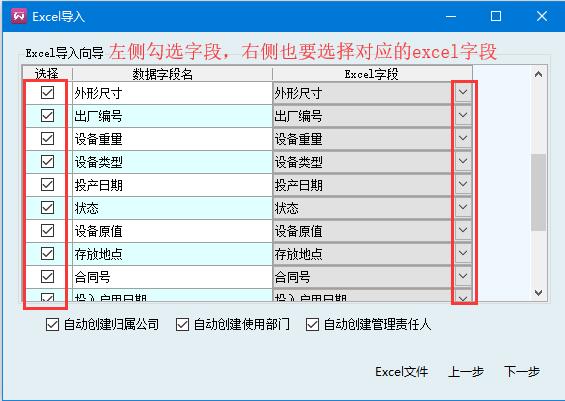 3、在彈出的窗口中,左側(cè)勾選要導(dǎo)入的字段,右側(cè)也要選擇對應(yīng)的excel字段,選擇好以后,點擊下一步