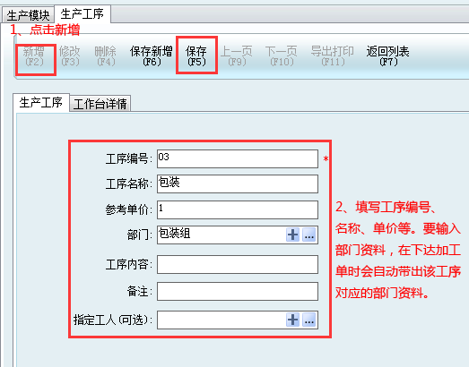 1、 在為產品添加工序前,先記錄好企業常用的生產工序。在生產模塊—工序管理,點開工序管理之后,點擊新增,然后填寫工序編號、工序名稱、單價等信息,要填寫部門信息,在下達加工單時會自動帶出該工序對應的部門資料。填寫完后點擊保存。