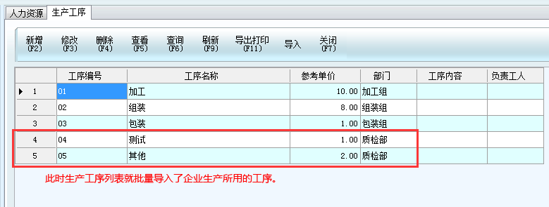 2、如果企業的常用工序較多,也可通過excel來批量添加工序。先在excel中編輯好工序資料,如下圖。點擊軟件菜單欄導入,選擇excel文檔,然后選擇好導入字段,就可以把工序導入。(導入的excel要求是2003版本)