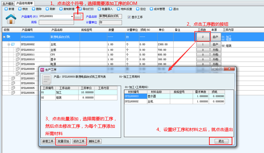3、在產品結構清單中,先選擇需要添加工序的BOM,再點擊工序數按鈕,然后再彈出的窗口中點擊批量添加,選擇需要的所有工序,然后為每個工序添加所需的材料,設置好之后點擊退出。這樣就完成了在BOM中添加工序。