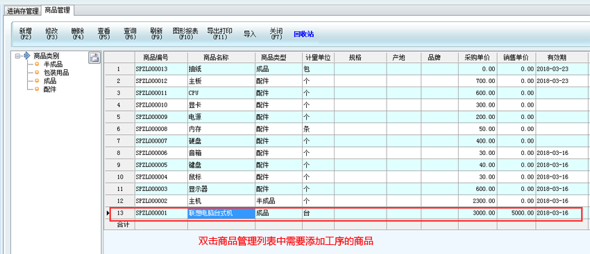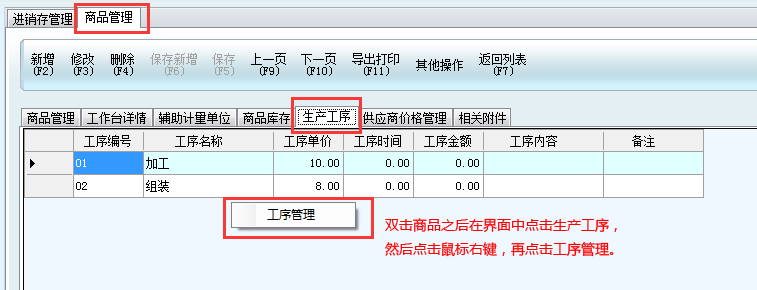 4、對于一些不需要做BOM表的用戶,可以在商品管理中為商品添加工序。在進銷存管理—商品管理中,商品管理的列表中雙擊需要添加工序的商品。