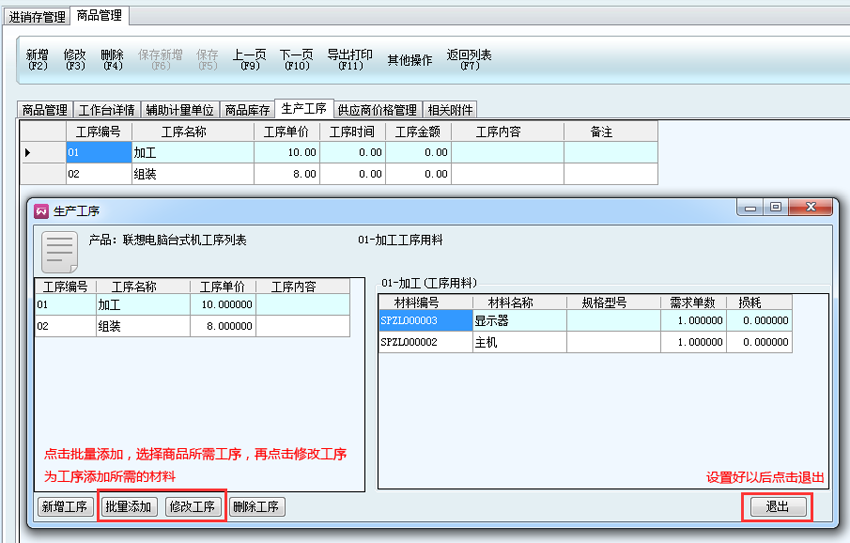 5、在打開的商品界面,點擊生產工序,然后任意地方點擊鼠標右鍵,點擊工序管理。在彈出的窗口中,點批量添加,選擇所需工序,然后點擊修改工序,為工序添加所需材料,設置好以后點退出。這樣就完成了在商品管理中設置工序。