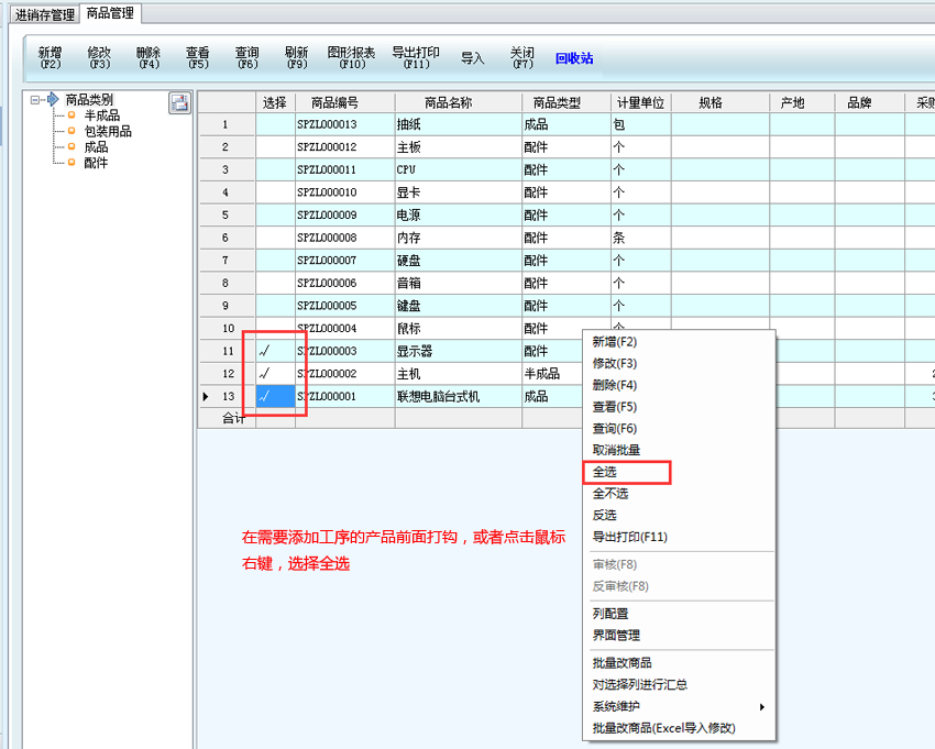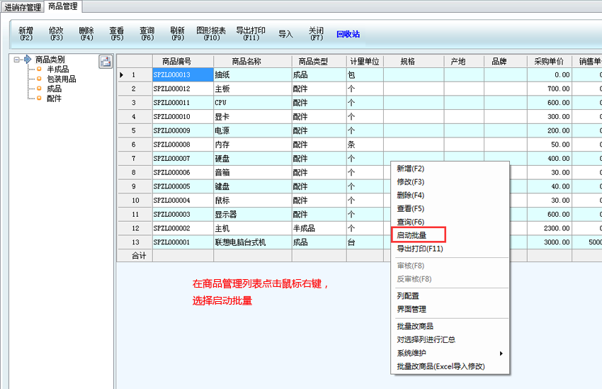 6、也可以在商品管理中批量對商品進行添加工序。在商品列表中點擊鼠標右鍵,選擇啟動批量。勾選需要添加工序的商品或者點擊鼠標右鍵選擇全選,然后再點鼠標右鍵,選擇批量改商品。