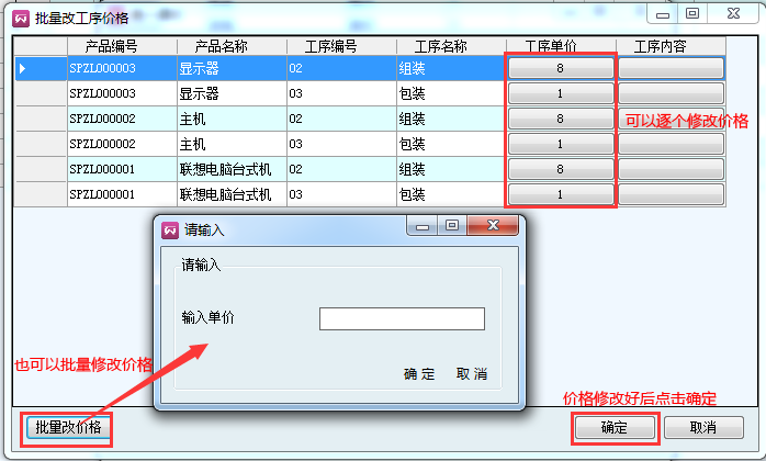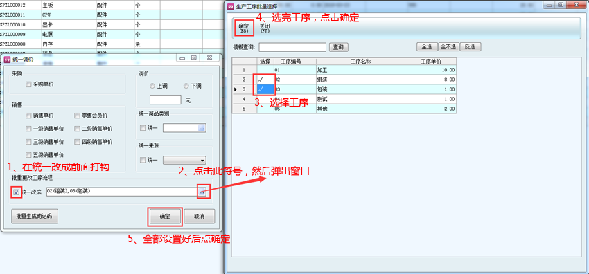 7、在彈出的窗口中,統一改成前面打鉤,然后點擊…符號,在彈出窗口中選擇工序,然后點擊確定。之后彈出窗口批量修改工序價格,可以逐個修改,也可以批量修改價格,價格填好以后,點擊確定。這樣就完成了批量添加工序了。