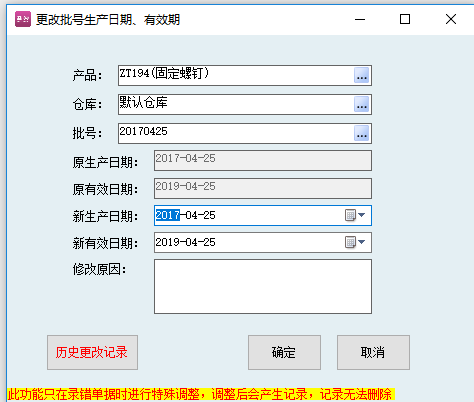 入庫時錄錯生產日期和有效期,入庫商品已經被引用不能反審核情況下,更改剩余產品的生產日期和有效期。會保留相關的更改記錄。