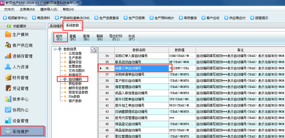 1、在系統(tǒng)維護-系統(tǒng)參數(shù)-自動編碼,選擇銷售訂單自動編碼,點擊菜單欄修改