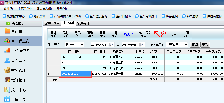 3、重新登錄系統(tǒng)后,下達銷售訂單后,可見銷售訂單編號變成00022018001, 0002 就是該客戶的客戶編號