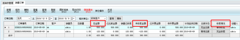 5、此時,回到銷售訂單列表界面,可以看到,這張訂單顯示已收款金額為500,收款情況是完全收款。