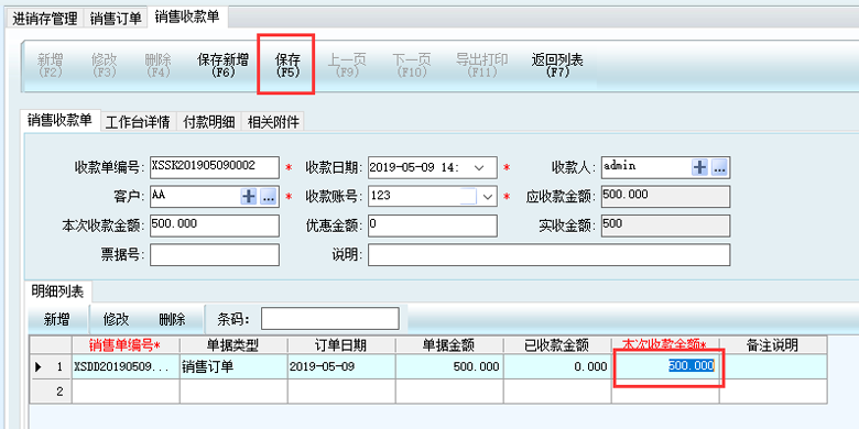 4、填寫本次收款金額,一張銷售訂單可以分多次收款,填寫完之后點擊保存