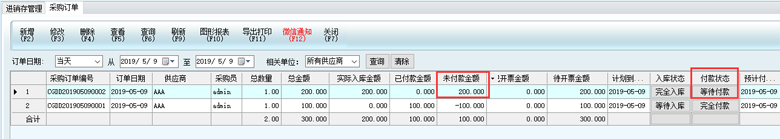 付款狀態(tài)不要手動(dòng)修改,軟件在做了采購(gòu)付款單中,這里的狀態(tài)會(huì)自動(dòng)改變(如果手動(dòng)把等待付款改成完全付款的話,那么軟件會(huì)自動(dòng)判斷不需要再做付款,在采購(gòu)付款單里面引用不到采購(gòu)訂單);