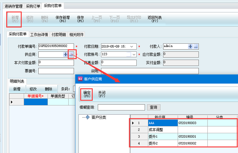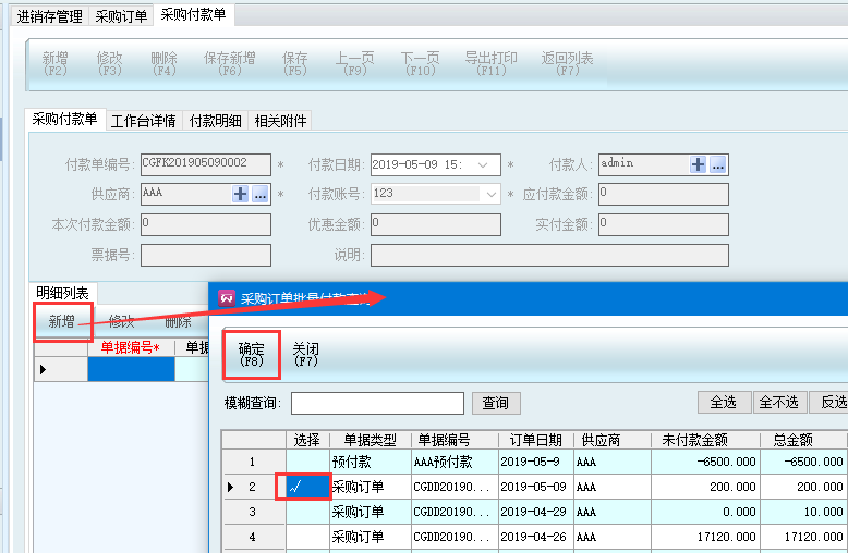 3、點(diǎn)擊從表新增按鈕,選擇要付款的訂單,然后點(diǎn)擊確定