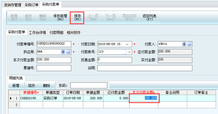 4、填寫(xiě)本次付款金額,一張采購(gòu)訂單可以分多次付款,填寫(xiě)完之后點(diǎn)擊保存
