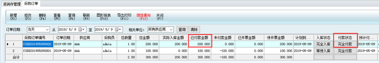 5、此時(shí),回到采購(gòu)訂單列表界面,可以看到,這張訂單顯示已付款金額為200,付款情況是完全付款。