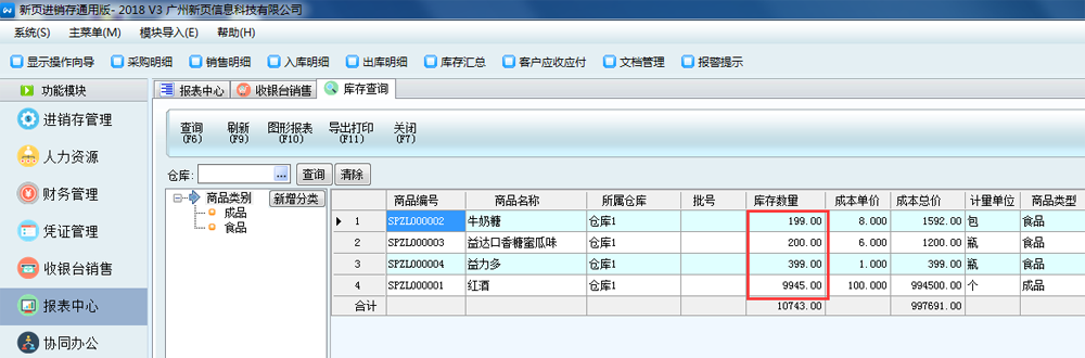 2、商品資料錄入之后,需要先增加商品庫存,增加庫存一般有三種方法,第一采購流程、第二期初庫存、第三其他入庫,可在報(bào)表中心-庫存查詢中查到商品的庫存數(shù)量,軟件默認(rèn)是先進(jìn)先出的,如果商品沒有庫存,是沒法做收銀臺銷售的