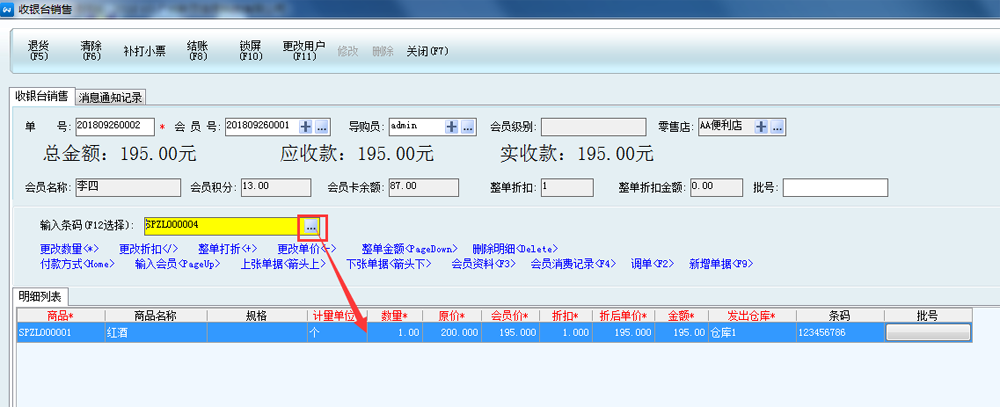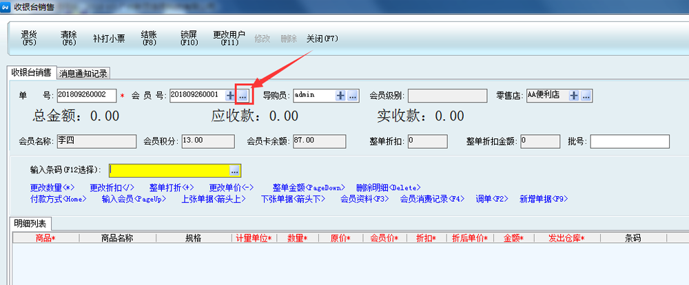 6、如果顧客是會員,則先選擇會員號,如果不是會員,可以忽略,然后點(diǎn)擊選擇條碼的…按鈕,選擇商品之后,點(diǎn)擊鍵盤ENTER,就會在明細(xì)列表帶出商品信息(也可用掃碼槍掃描商品條碼)
