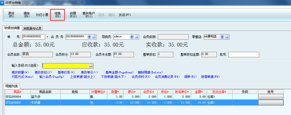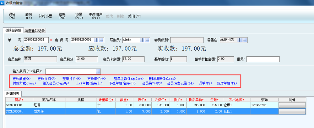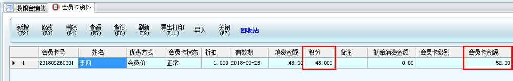 11、如果是會員消費(fèi),在會員消費(fèi)完之后,可以查看到會員的積分、會員卡余額等