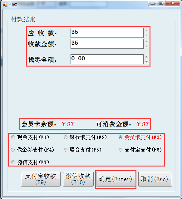 9、在彈出的窗口中,會顯示應(yīng)收款、收款金額,如果是會員,還會顯示會員卡余額、可消費(fèi)金額,再選擇支付方式,點(diǎn)擊確定。