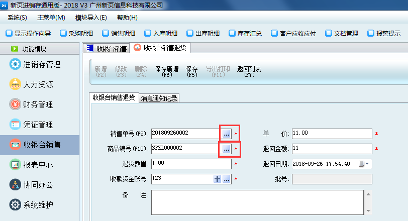 12、當(dāng)發(fā)生退貨時(shí),可以在收銀臺銷售-收銀臺銷售退貨操作,打開收銀臺銷售退貨,選擇退貨的訂單和商品,核對金額和數(shù)量,點(diǎn)擊保存