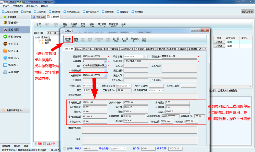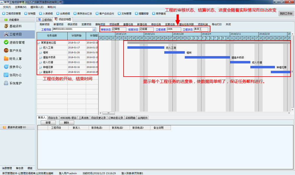 圍繞項目的(任務(wù)、進度、出庫、入庫、借用、人工、合同等)進行管理;
