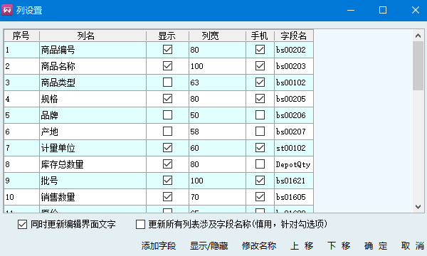 支持自定義字段名稱、顯示/隱藏、是否必填、默認小數位數、權限類型;